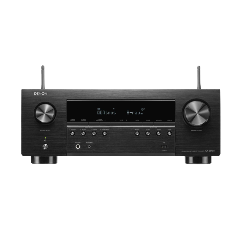 The AVR-S970H offers immersive surround sound with Dolby Atmos, DTS:X, 8K HDMI pass-through, HEOS multiroom, voice assistant compatibility, and Audyssey calibration.
