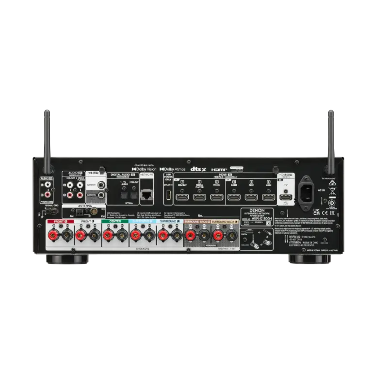 The Denon AVR-X1800H is a 7.2-channel AV receiver with 80 W per channel (8 Ω), 8K/4K120Hz HDMI passthrough, Dolby Atmos & DTS:X support, HEOS built-in streaming and Audyssey MultEQ calibration. Robust inputs and modern gaming features (ALLM/VRR) make it suitable for living-room theater and music.